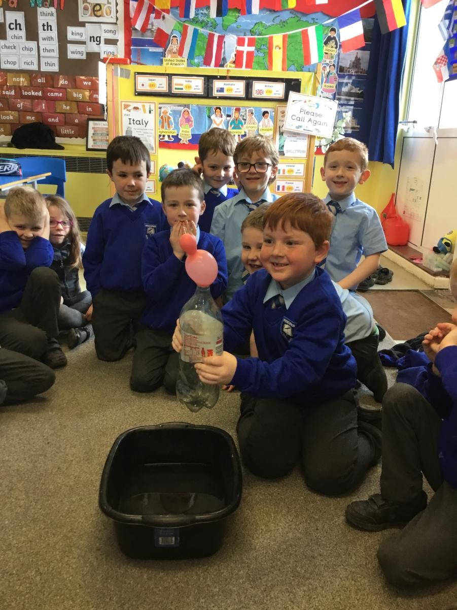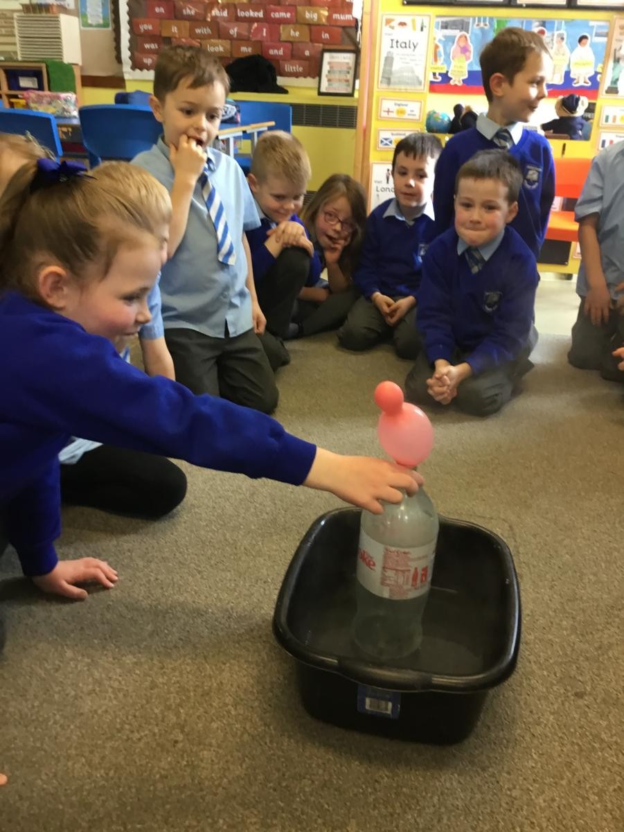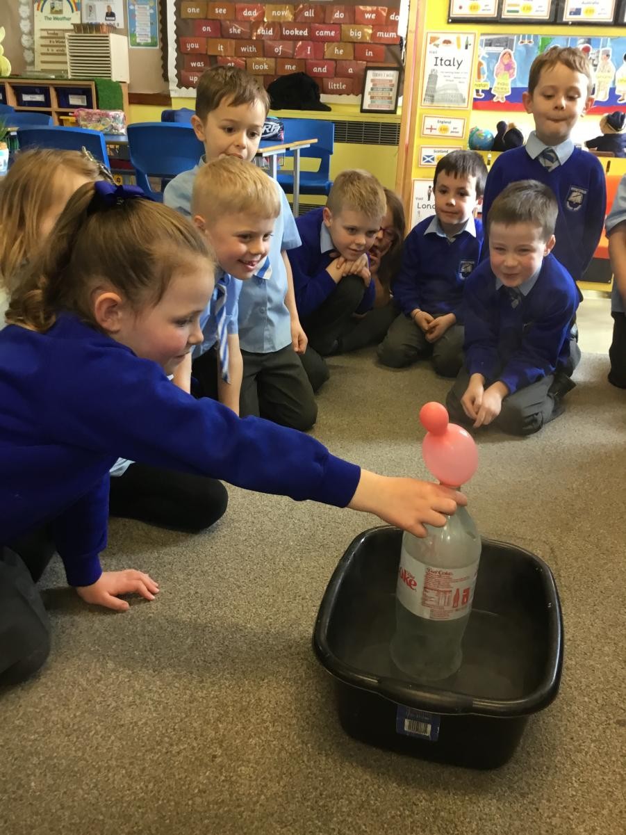 In our travel and transport topic we have enjoyed finding out about hot air balloons and what makes them rise up in the air. For our experiment we attached a balloon onto the end of a bottle and put it in a basin of cold water and then into a basin of very hot water. The results were astonishing! The balloon began to fill with air and inflate when we put it into the basin of hot water. We learnt that hot air rises. The balloon also inflated when we squeezed the bottle as this caused the air to push up into the balloon.