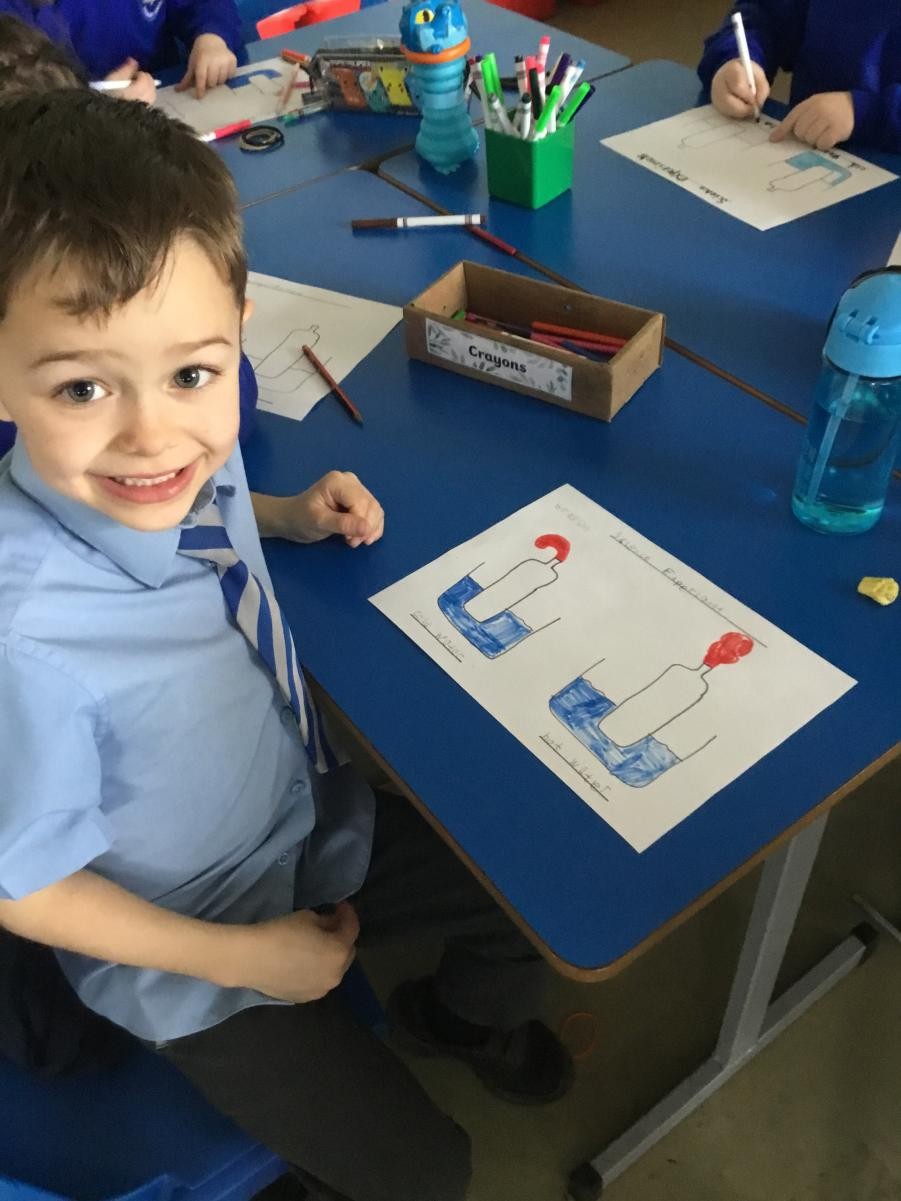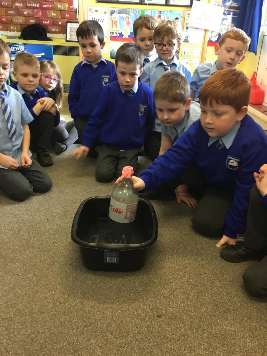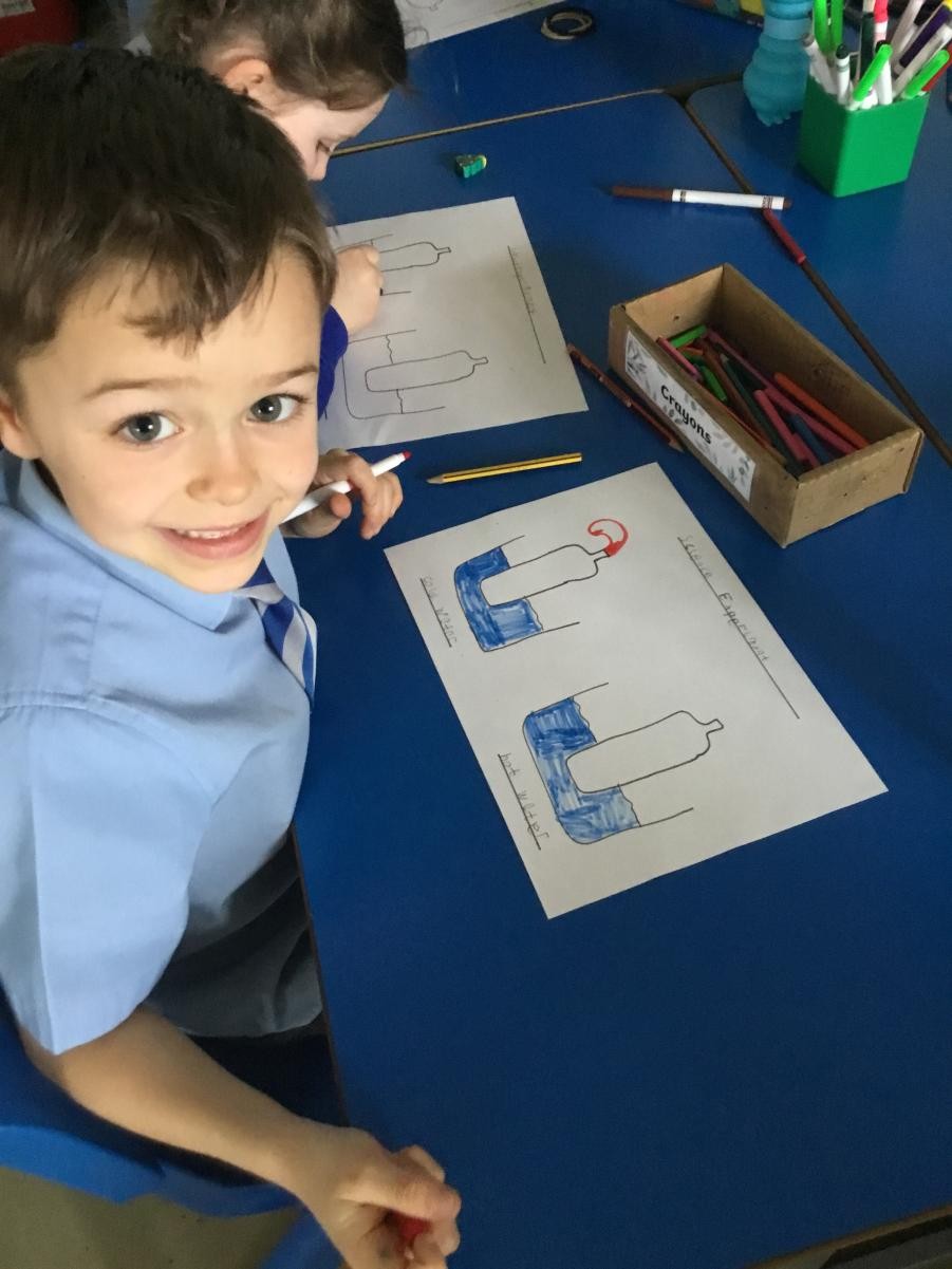 In our travel and transport topic we have enjoyed finding out about hot air balloons and what makes them rise up in the air. For our experiment we attached a balloon onto the end of a bottle and put it in a basin of cold water and then into a basin of very hot water. The results were astonishing! The balloon began to fill with air and inflate when we put it into the basin of hot water. We learnt that hot air rises. The balloon also inflated when we squeezed the bottle as this caused the air to push up into the balloon.