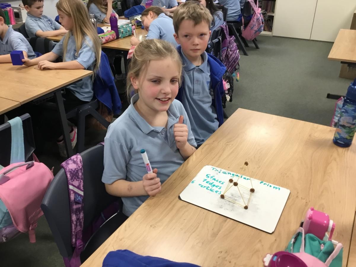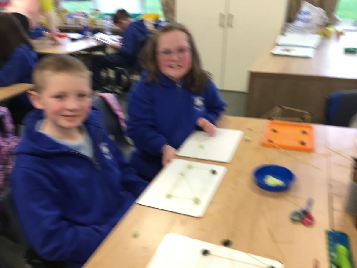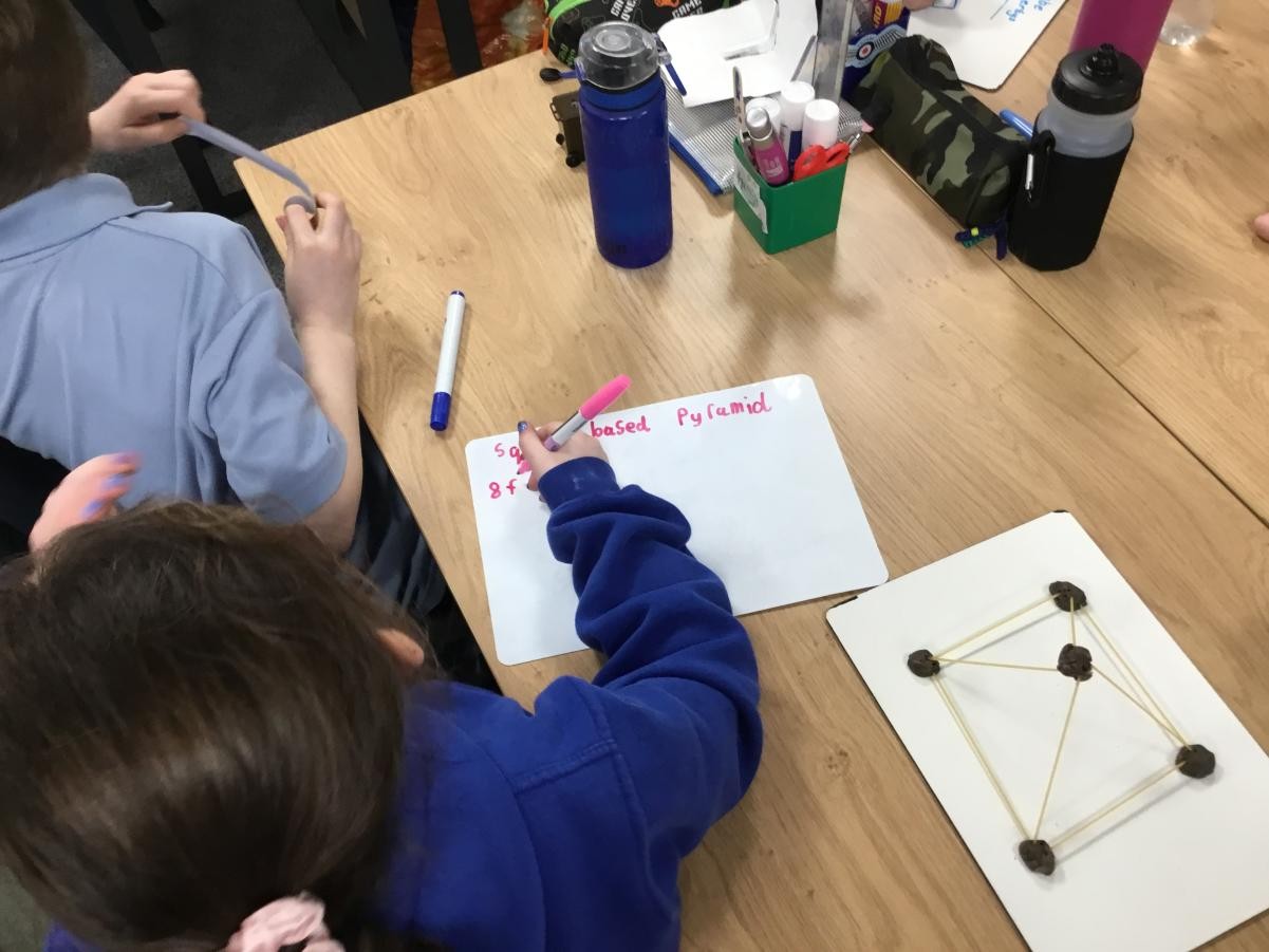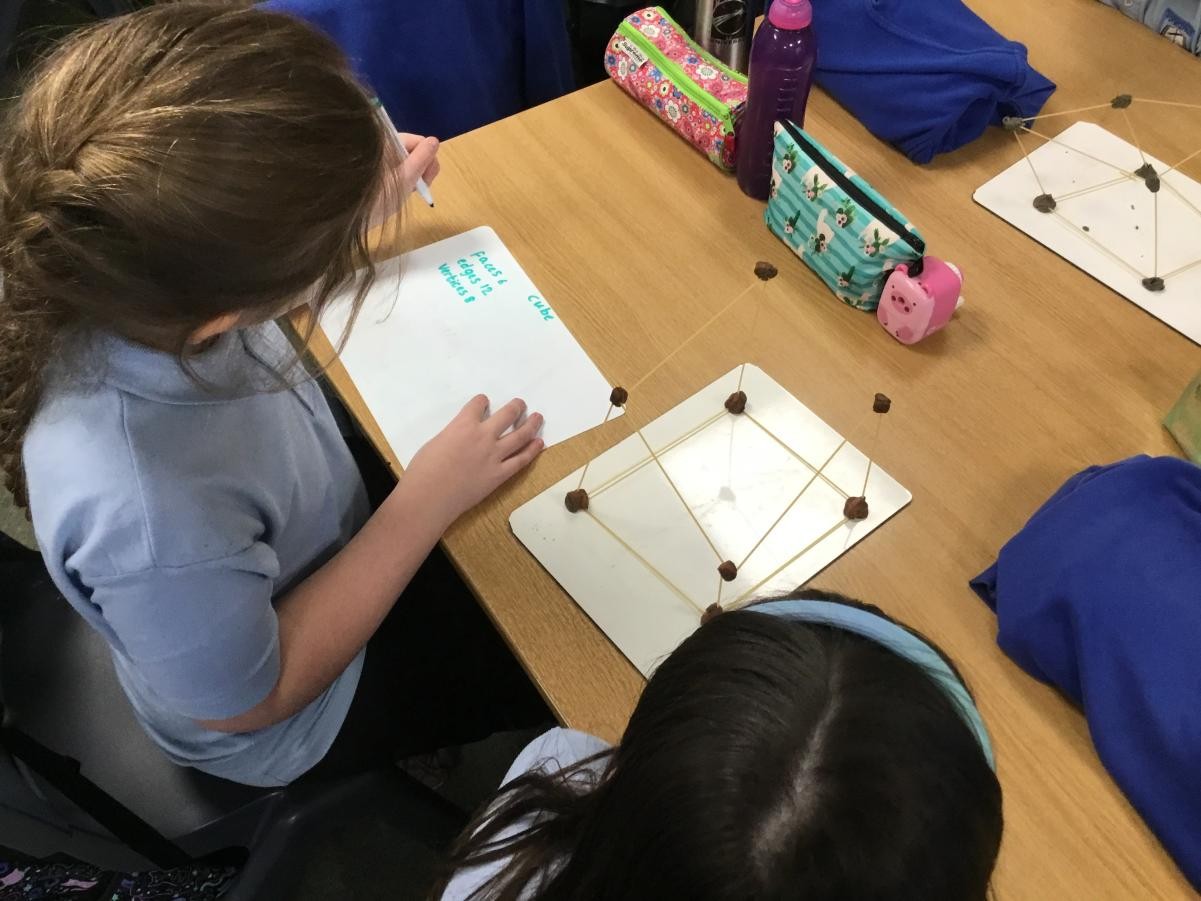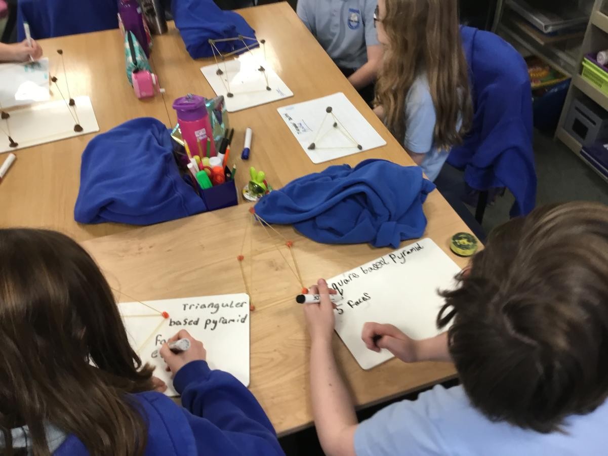 P5/6 have been exploring 3D shapes. We talked about the properties of a range of shapes using words like face, vertices and edges. We then had a go constructing our own 3D shapes with a partner.